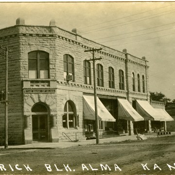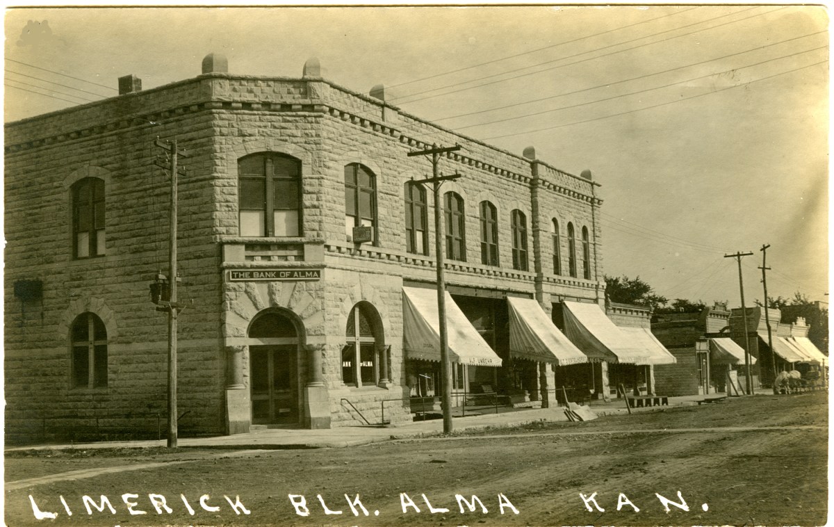 In 1932 the Alma National Bank, the Farmers National Bank, and The Bank of Alma consolidated into the 1st National Bank and moved into the Limerick Building, seen here in an early 1910s photo postcard.