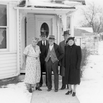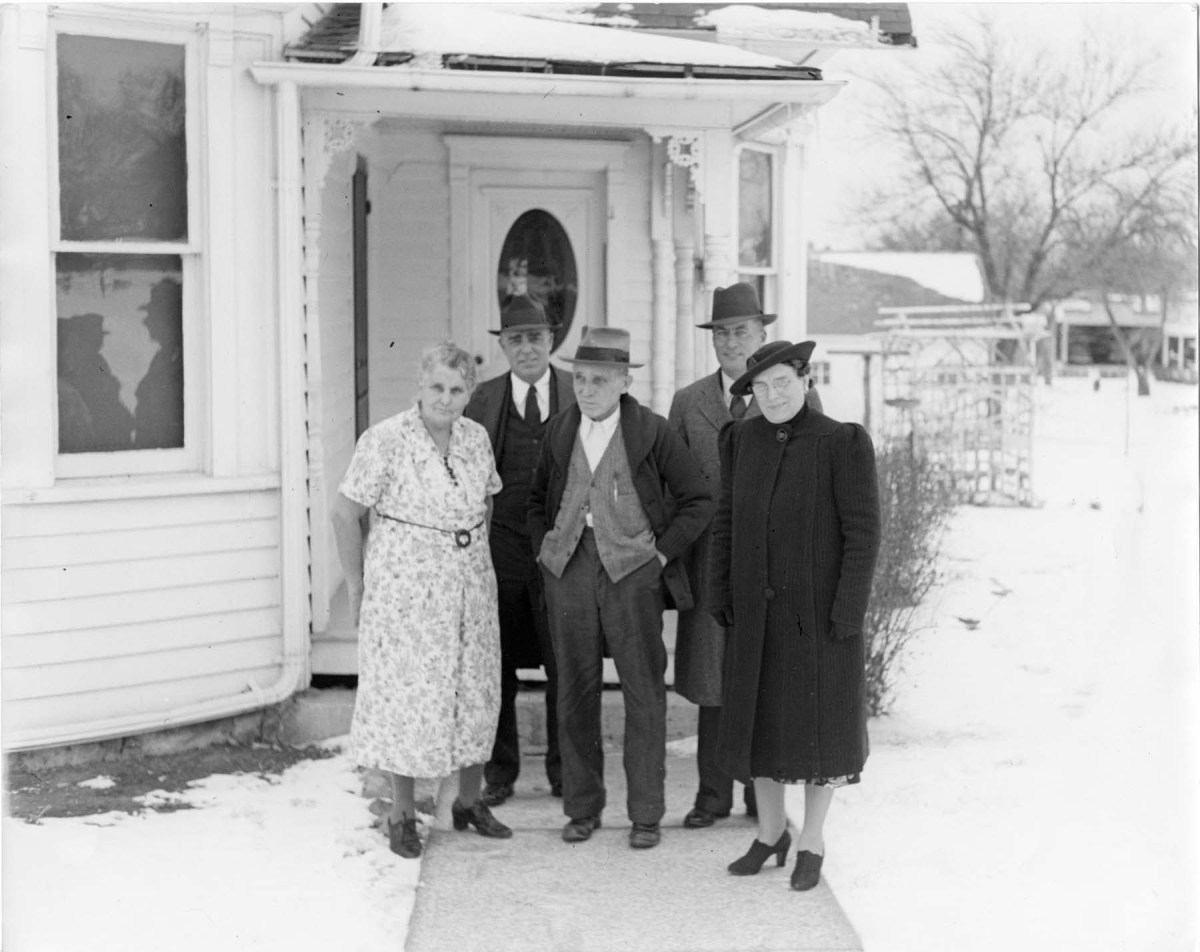 The Palenske family stand in front of Louis and Emma Palenske’s “retirement house”, located at 604 Kansas Avenue in Alma, Kansas, in this view, circa 1940. From left, Emma Palenske, Fred Palenske, Louis Palenske, Martin Zwanziger, and Minnie Zwanziger.