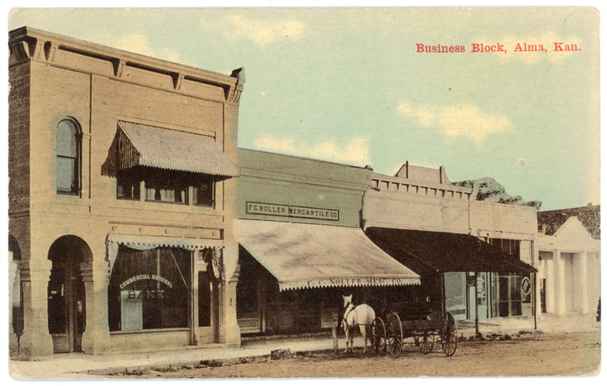 This photo postcard, produced circa 1908, shows the north end of the east side of the 200 block of Missouri Street in Alma. Buildings seen from left include, Louis Palenske’s Commercial National Bank, F.C. Noller Mercantile, the Alma telephone exchange, the Simon building, and the Airdome Theater. Colorized postcards such as this one were produced by printers who would take a real photo negative and apply it to a printing plate, arbitrarily assigning colors to various sections of the card.