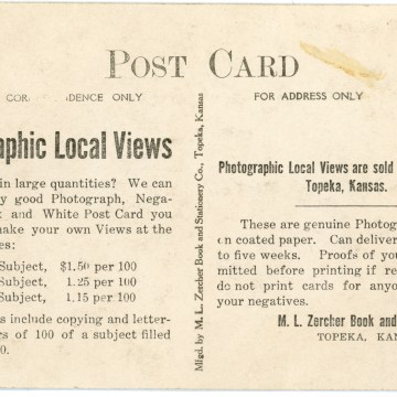 This card was produced to promote real photo postcards, listing the price for printing the cards. The card also notes that Zercher would make real photo postcards from customer’s pictures.