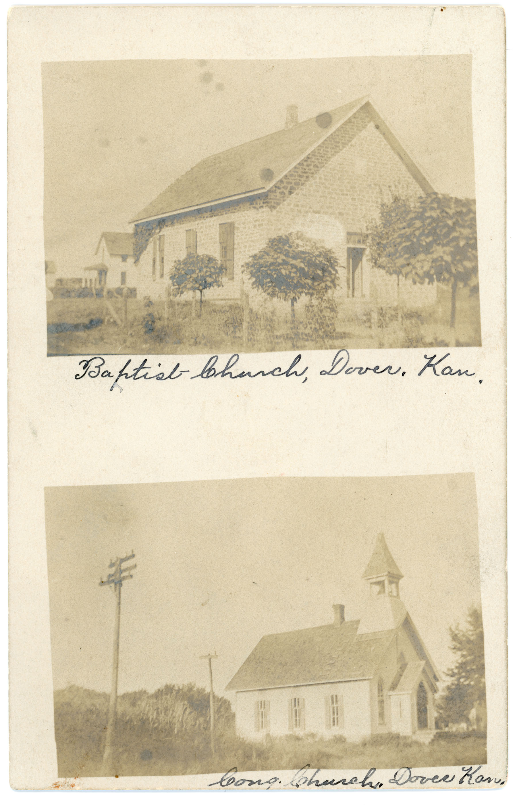 This real photo postcard is an undivided type, circa 1906, and shows two churches at Dover, Kansas, the Baptist Church and the Congregational Church.