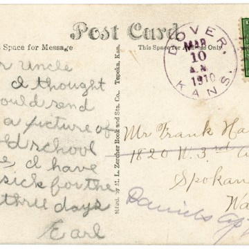This postcard, dated March 10, 1910, refers to the “old school house” at Dover, Kansas.