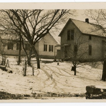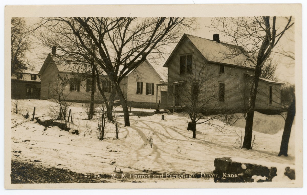 The M. E. Church and Parsonage at Dover, Kansas are seen on this real photo postcard by Zercher Book and Stationery, circa 1910.
