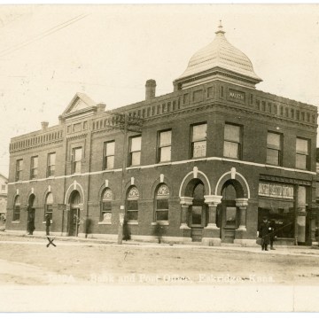 This 1911 view of the Waugh Building in Eskridge shows the Walker house at the far left when the house still had a turret on the roof.