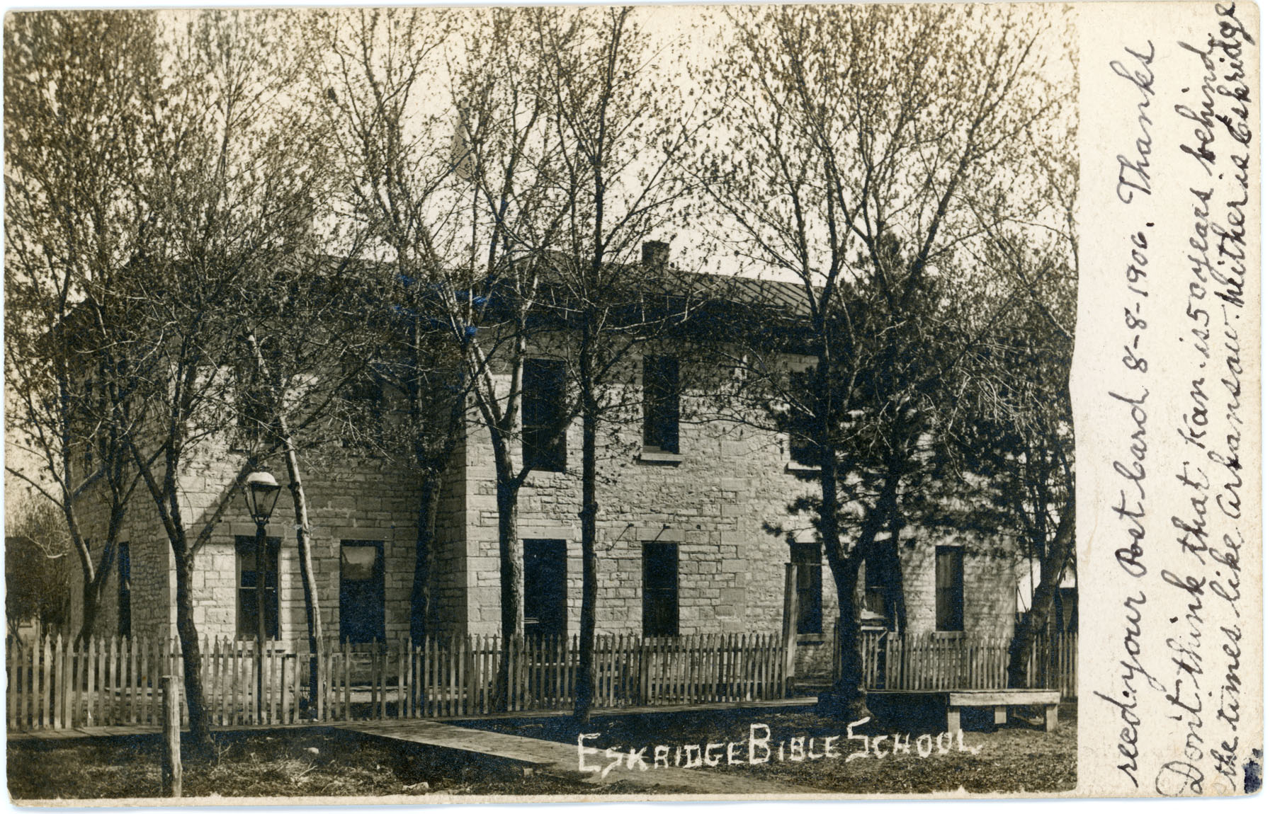 This postcard, dated 8-8-1906, shows the Eskridge Bible School. Notice that this card has an undivided back.