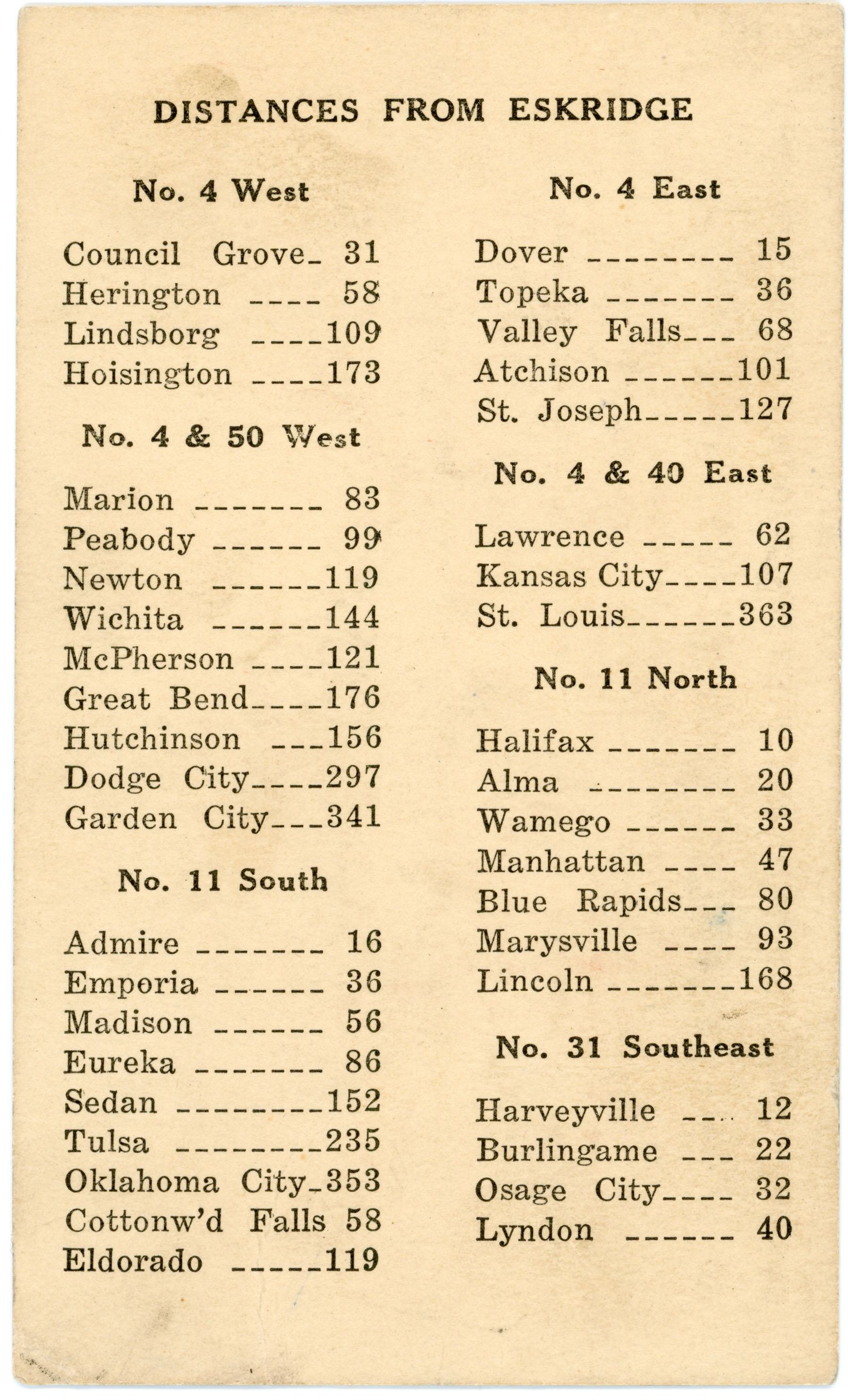 The reverse of this trade card has a listing of Kansas towns and their distances from Eskridge.