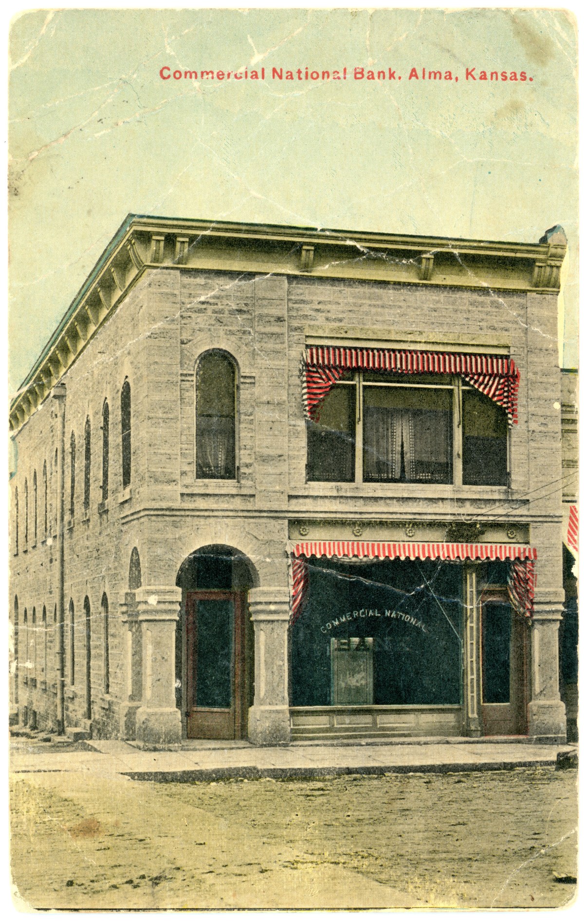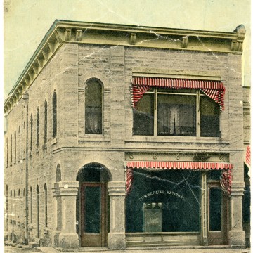 This colorized photo postcard of Louis Palenske’s Commercial National Bank at Alma bears a postmark date of 1911.