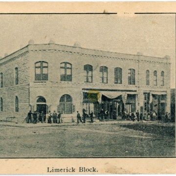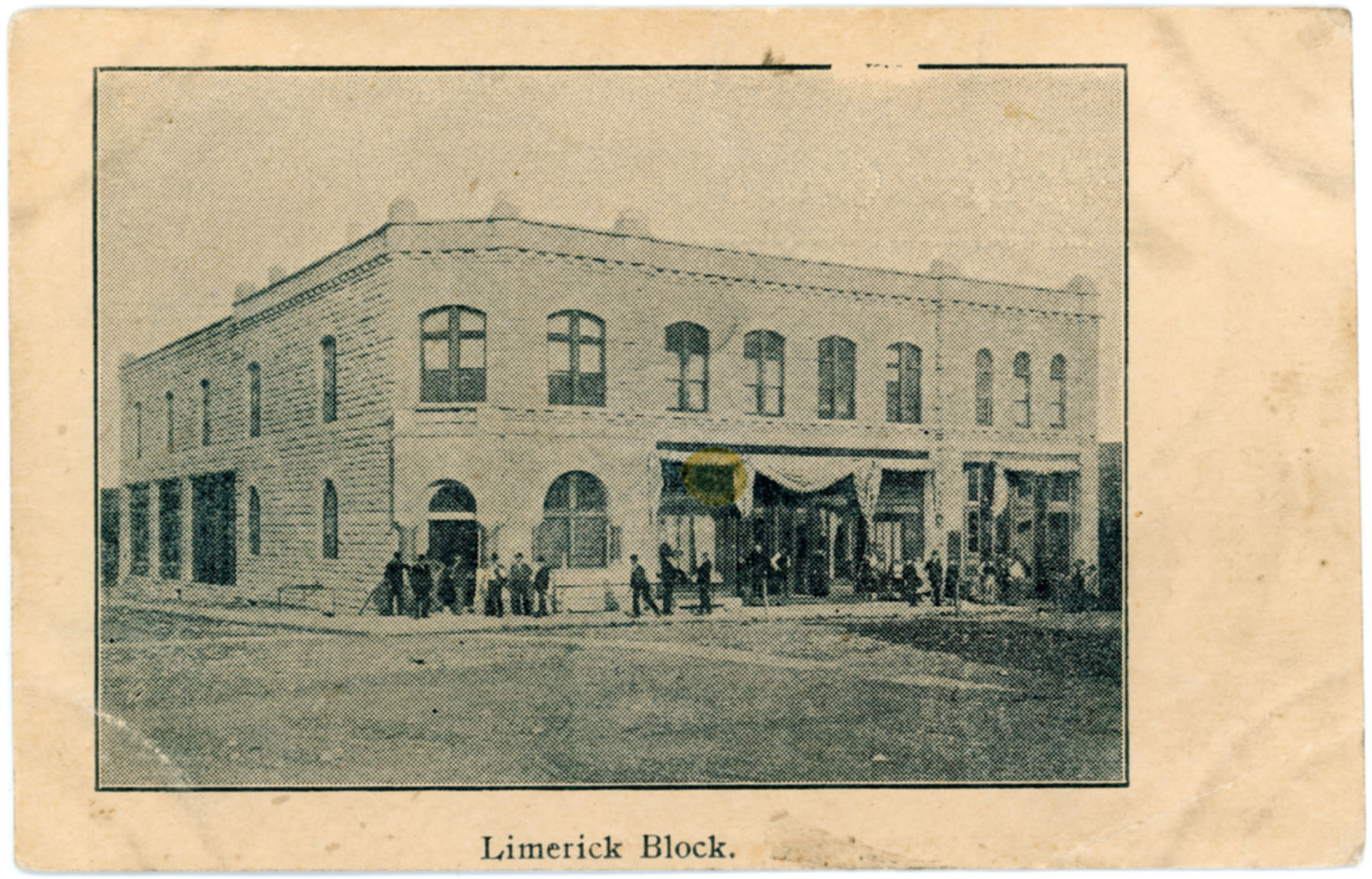 This 1906 view of the Limerick Block in Alma, Kansas was produced by offset printing rather than being produced with photographic paper.