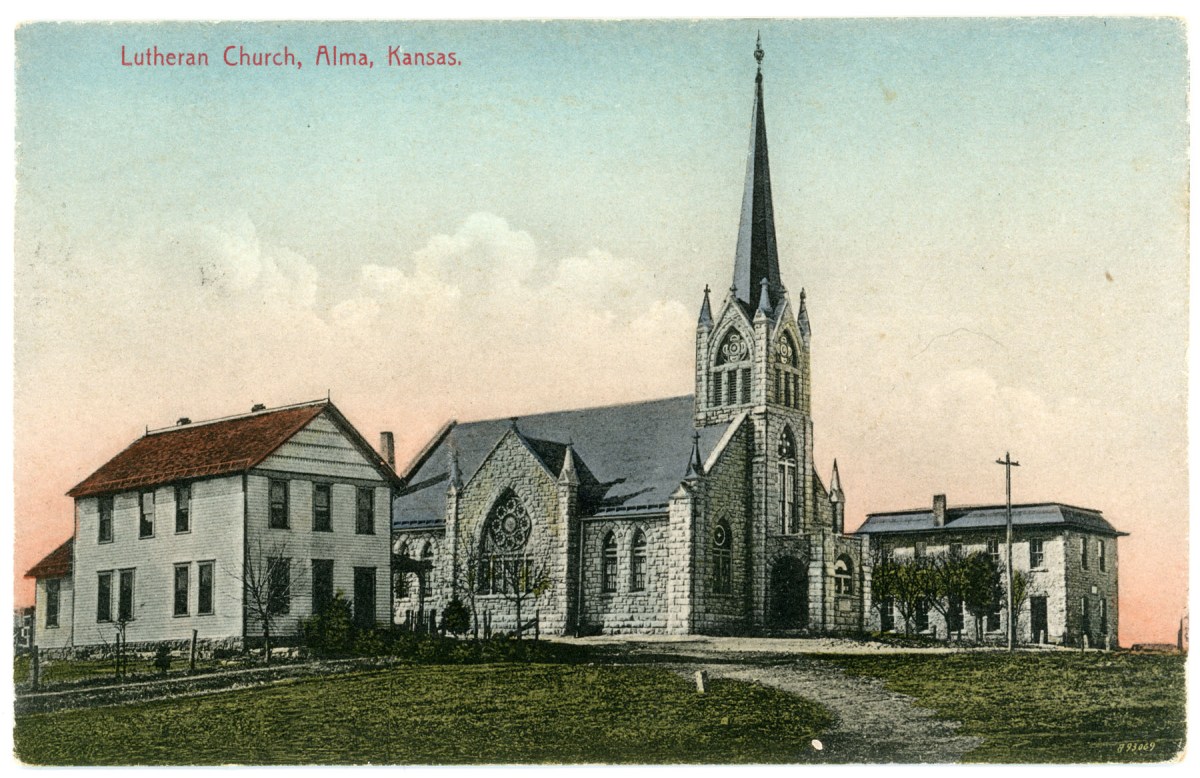 This colorized photo postcard by the Kansas Post Card Company of Salina, Kansas bears a 1910 postmark. The card, written in German, is addressed to Mrs. Moritz Kraus of Alma, Kansas.