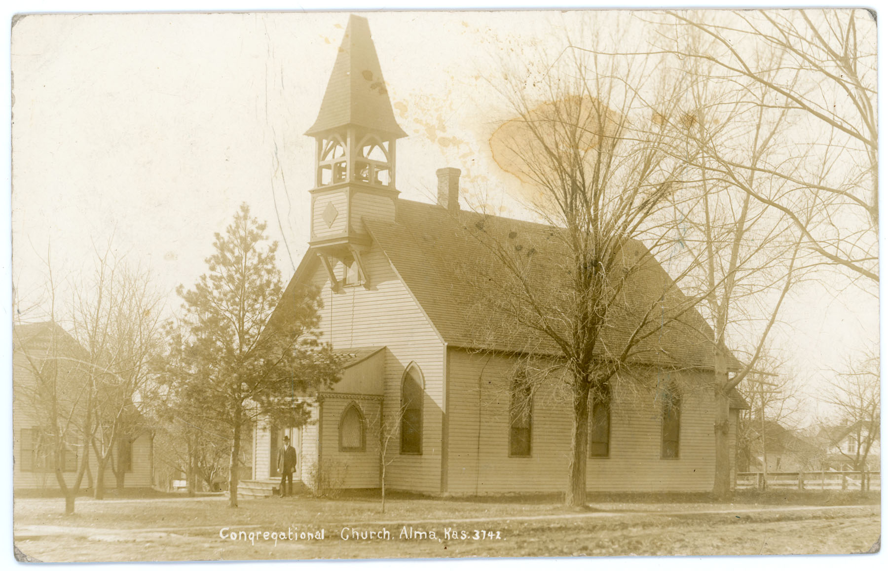 This real photo postcard by C. U. Williams, circa 1910, shows the Alma Congregational Church located at the corner of 7th and Ohio Streets.