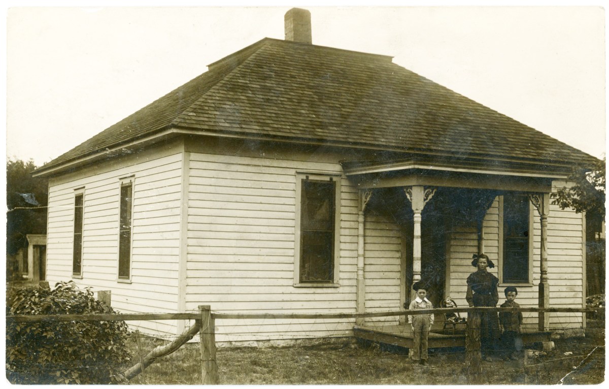 This real photo postcard, postmarked 1910, shows a woman and two children standing in front of their home in McFarland, Kansas.