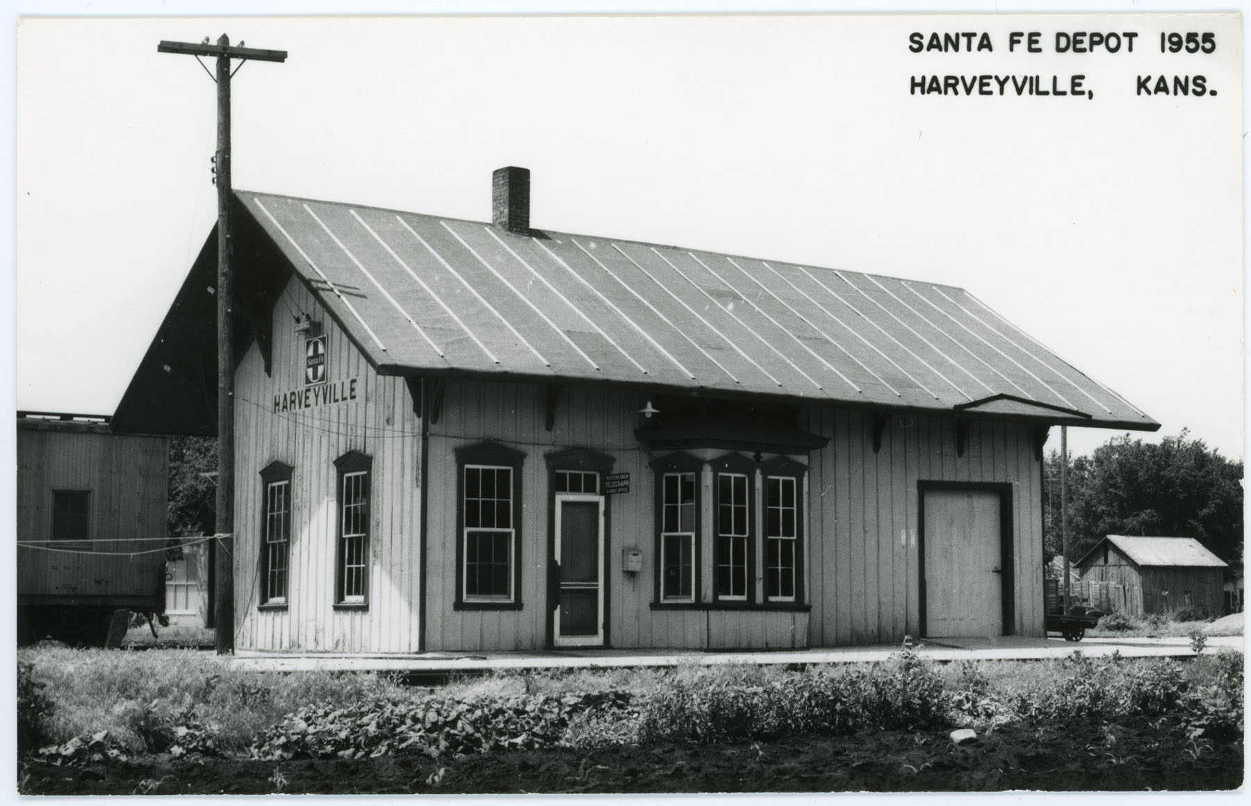 This view of the Atchison, Topeka & Santa Fe depot at Harveyville, Kansas bears a 1955 date.