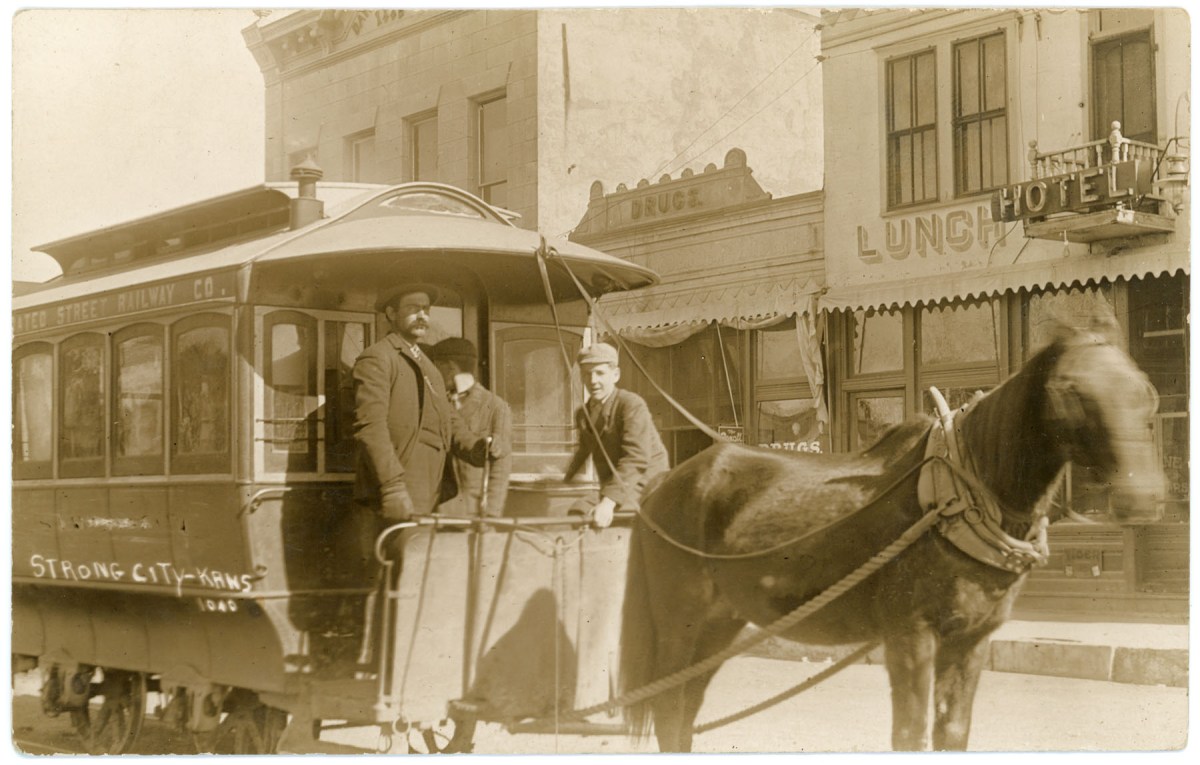 This real photo postcard showing the intercity horse-drawn trolley at Strong City, Kansas dates from about 1910.