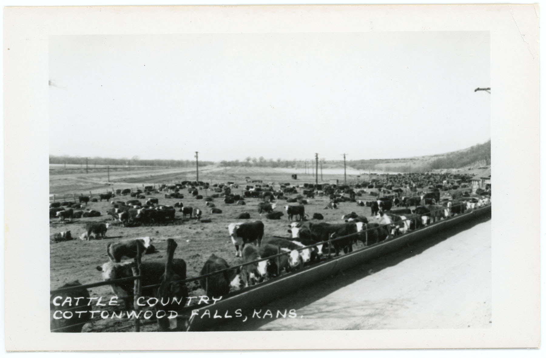 This undated real photo postcard shows a cattle feed lot located at Cottonwood Falls, Kansas.