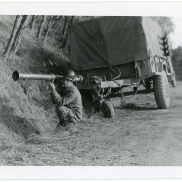 Fred Meditz positions a bazooka on his shoulder in this view from Neu-Ulm Germany, circa 1954-1956.
