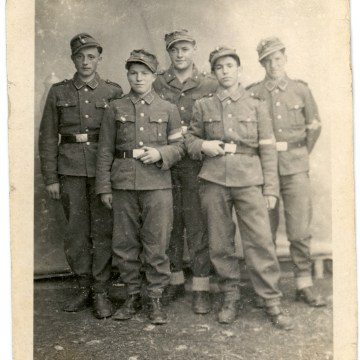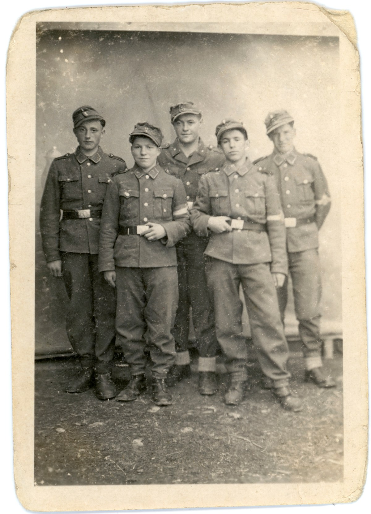 Five members of the Mannschaft, including Friedrich Meditz, second from right, pose for a photographer at Rann in this view from 1943.