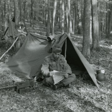 Fred Meditz sits in front of his tent during maneuvers near Neu-Ulm, Germany while in the U.S. Army, circa 1956.