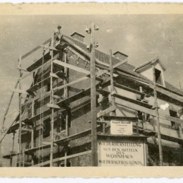 Friedrich Meditz, a stonemason, stands at the top of a Villach, Austria residence that is under reconstruction after bombing during World War II, circa 1949.