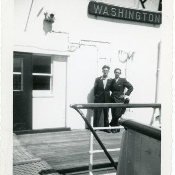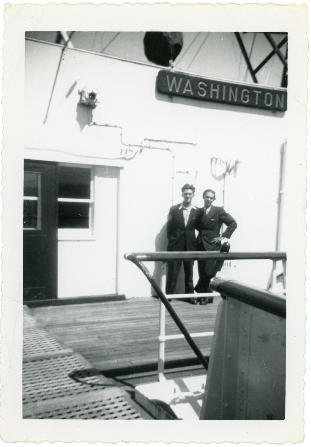 Friedrich Meditz, right, poses with an unidentified passenger aboard the U.S.S. Washington, dated July 25, 1950.