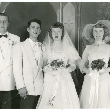 Friedrich and Mary Jean Meditz, center, pose with the two groomsmen and two bridesmaids following the Meditz wedding on July 14, 1951. Seen here from left to right are Tony Preston, Eugene Stalzer, Friedrich Meditz, Mary Jean Meditz, Dorothy Whiles, and Lou Ann Scherzer. The bride’s gown and bridesmaids’ dresses barely made it to the wedding.