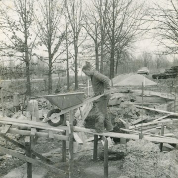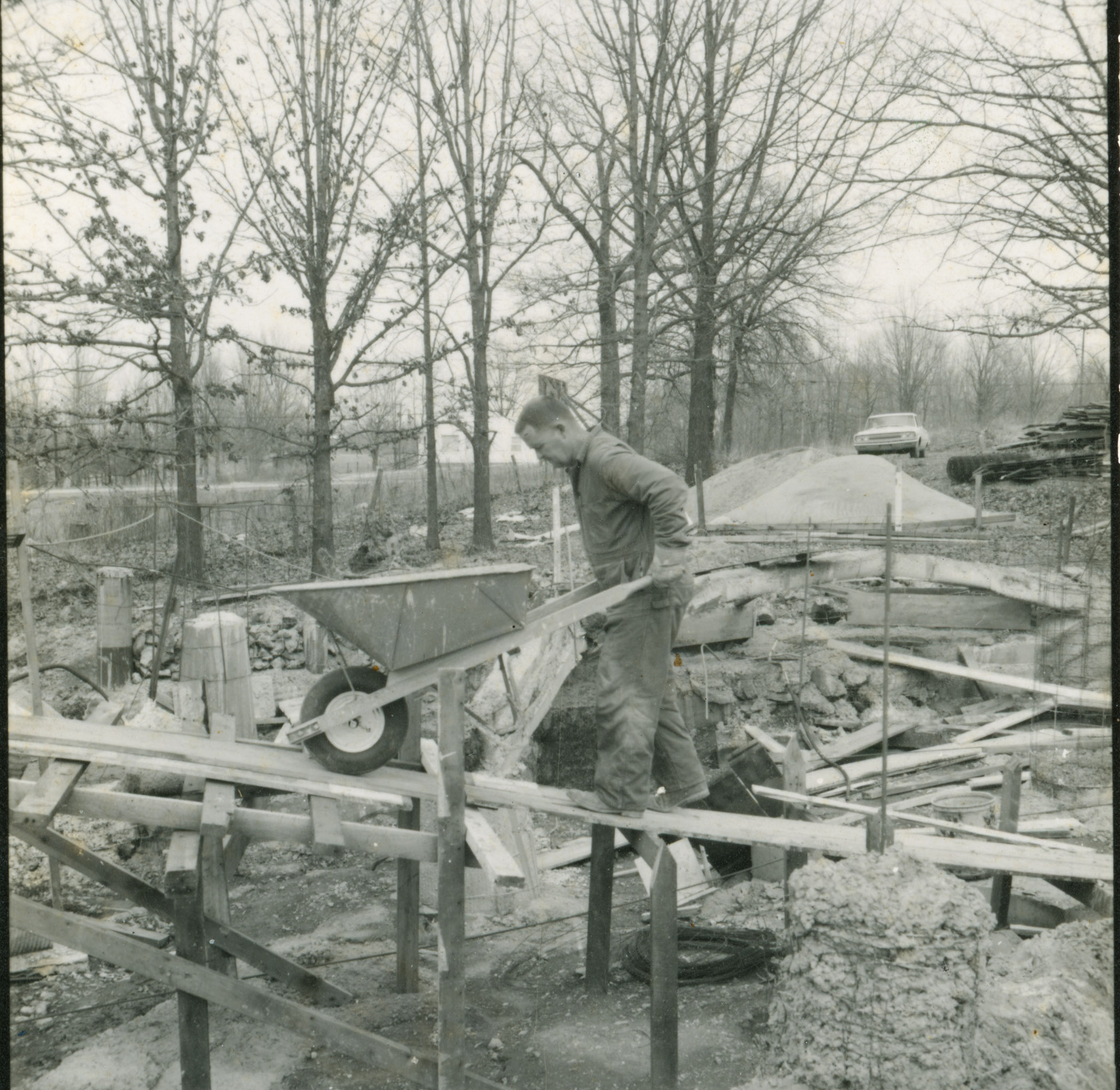 Carl Hoots wheels a load of cement as construction begins on the cave at Ozarka Village in January of 1969.