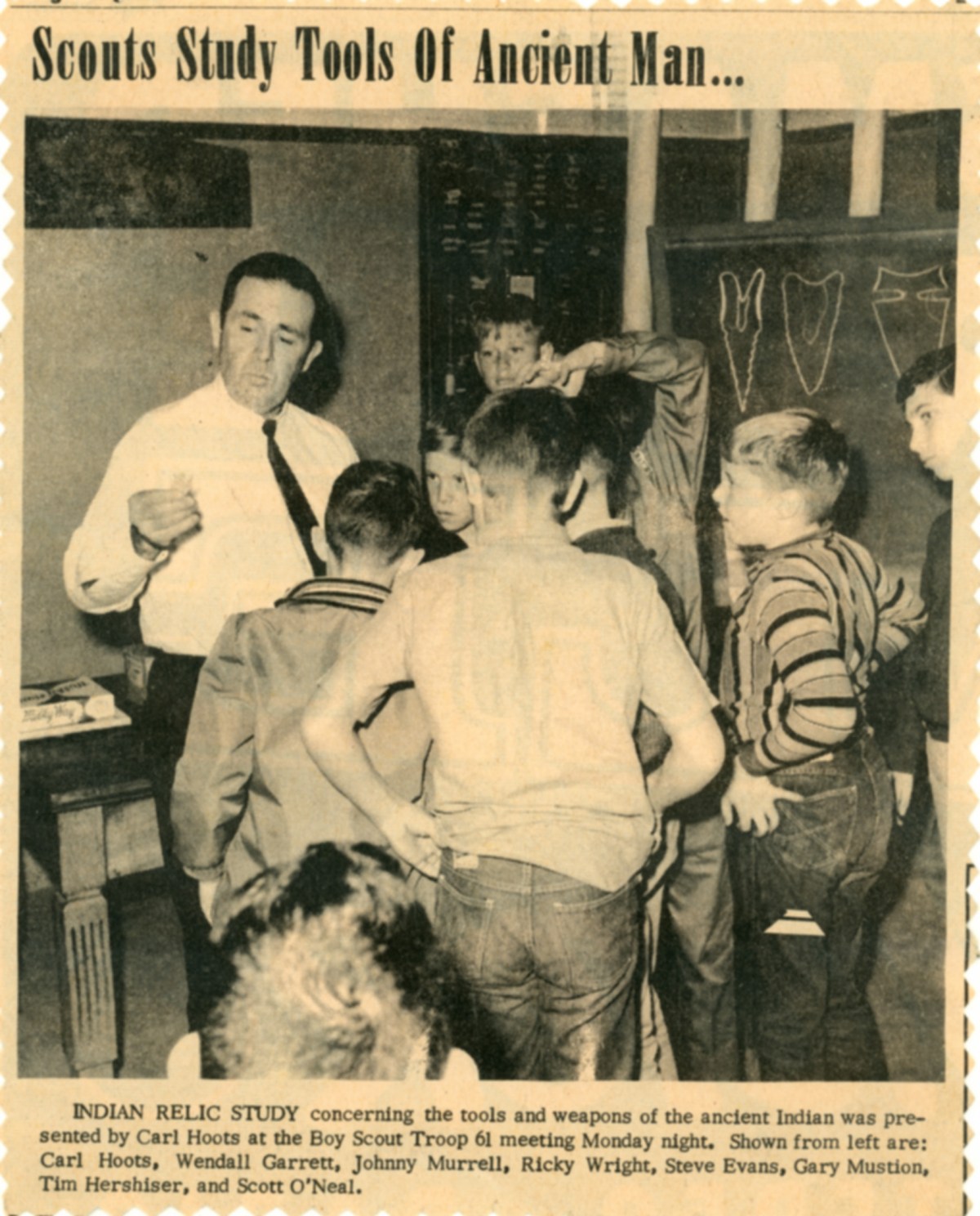 This view from the West Plains Daily Quill, taken in about 1966, shows Daddy teaching members of Boy Scout Troop 61 about prehistoric Indian artifacts.