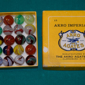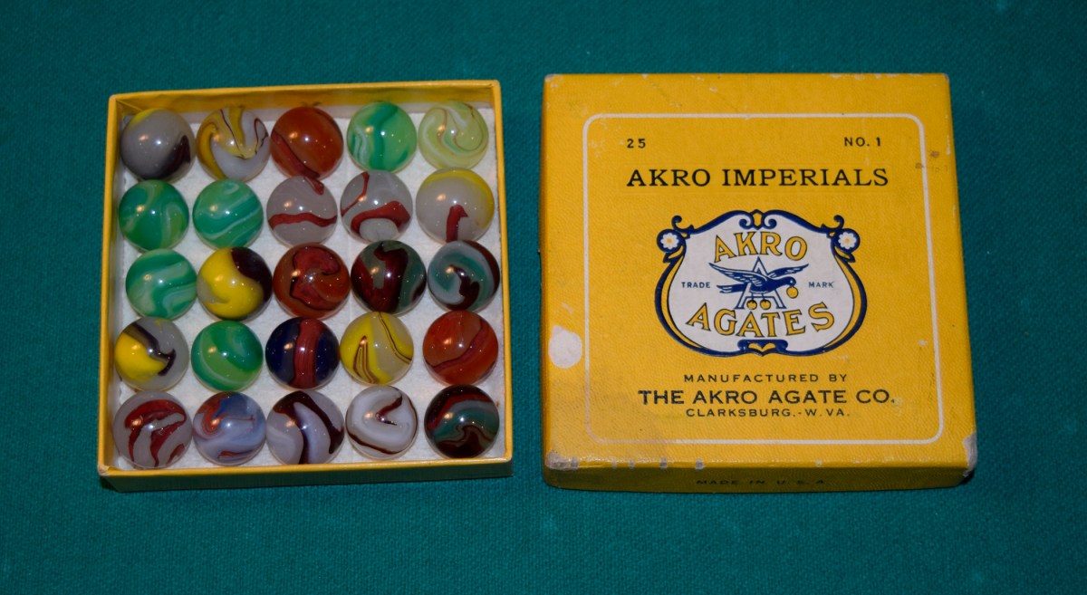 The Akro Agate Co. manufactured these marbles during the 1930s. This box of marbles was given to Brent Crow by his grandfather, Russell Woofter. Notice that the logo of the company was a crow in flight, holding marbles in its feet and beak. Courtesy Brent Crow.