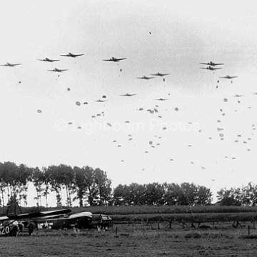 Members of the 82nd Airborne Division begin parachute to the ground in Holland in September of 1944. Notice the gliders already on the ground.