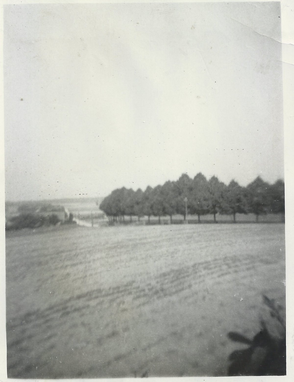 The roadblock where PFC Charlie Barnhart was wounded was located near the grove of trees visible along the horizon in this view. The abandoned building which held German troops is visible in the distance at the left side of the image.