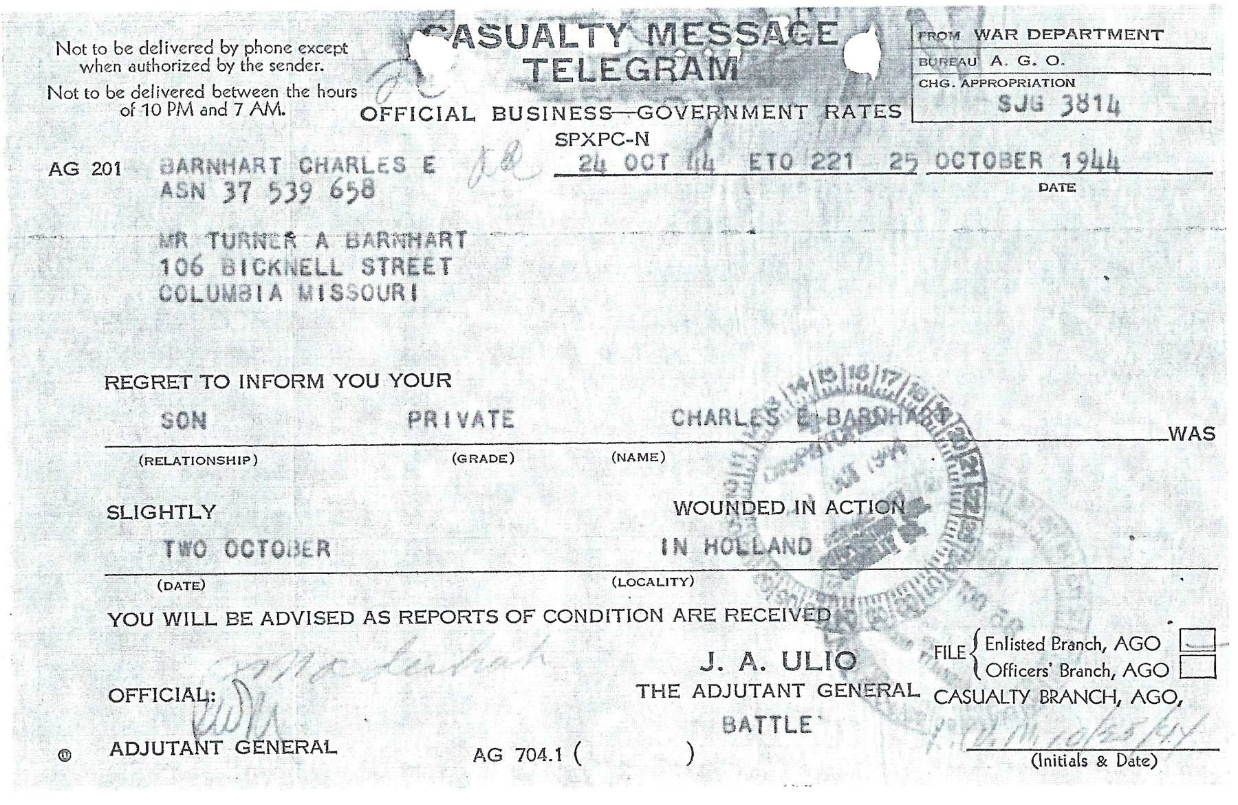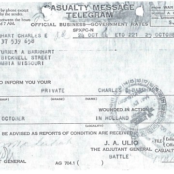 This telegram, dated October 24, 1944, was sent to Turner Barnhart of Columbia, Missouri, advising him that his son, PFC Charles Barnhart had been wounded in battle in Holland on October 2, 1944.