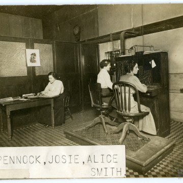Operators at the Alma, Kansas telephone exchange provided telephone service around the clock for subscribers to the company’s system. Seen here, from left to right are Ruth Pennock, Josie Smith and Alice Smith.
