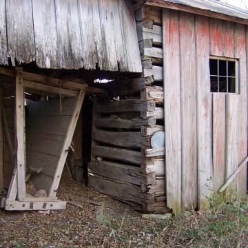 This log blacksmith shop on the Hensel homestead had been sided many years ago, making it resemble a conventional frame building.