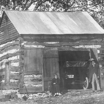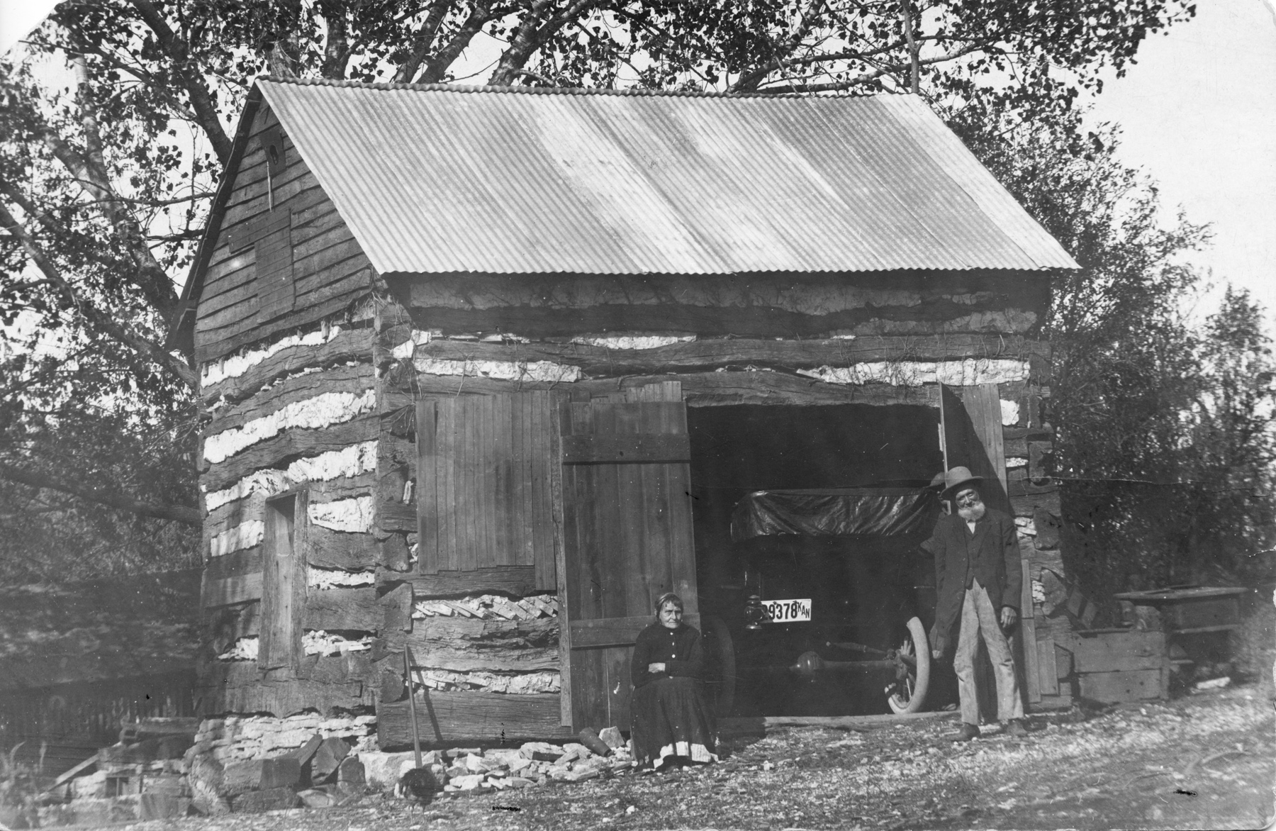 Sophia and William Horne pose in front of their homesteading cabin which the Hornes had converted to a garage when this photo was taken circa 1915. Photo courtesy Tony Meseke