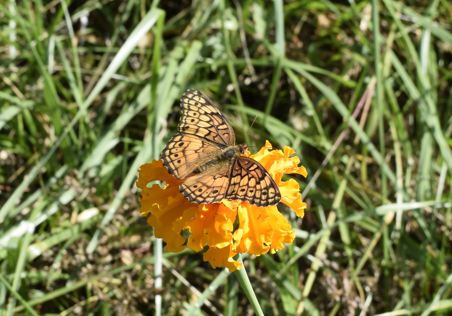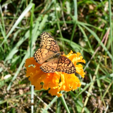 A Great Spangled Fritillary butterfly pauses on a Marigold in the butterfly garden.