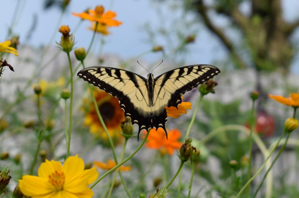 This Eastern Tiger Swallowtail pauses to feed on Cosmos, “Bright Lights”.