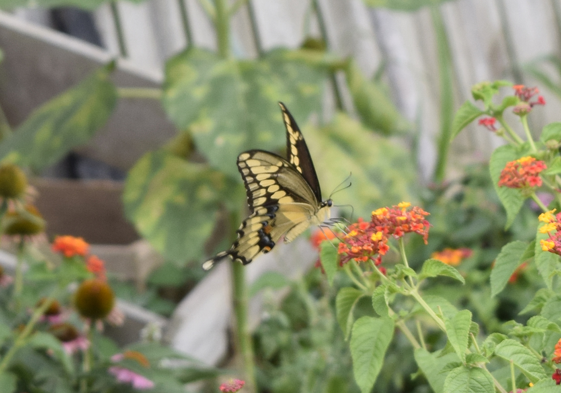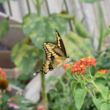 The Lantana flower blooms until the first frost, providing nectar for the late season butterflies, like this Giant Swallowtail.