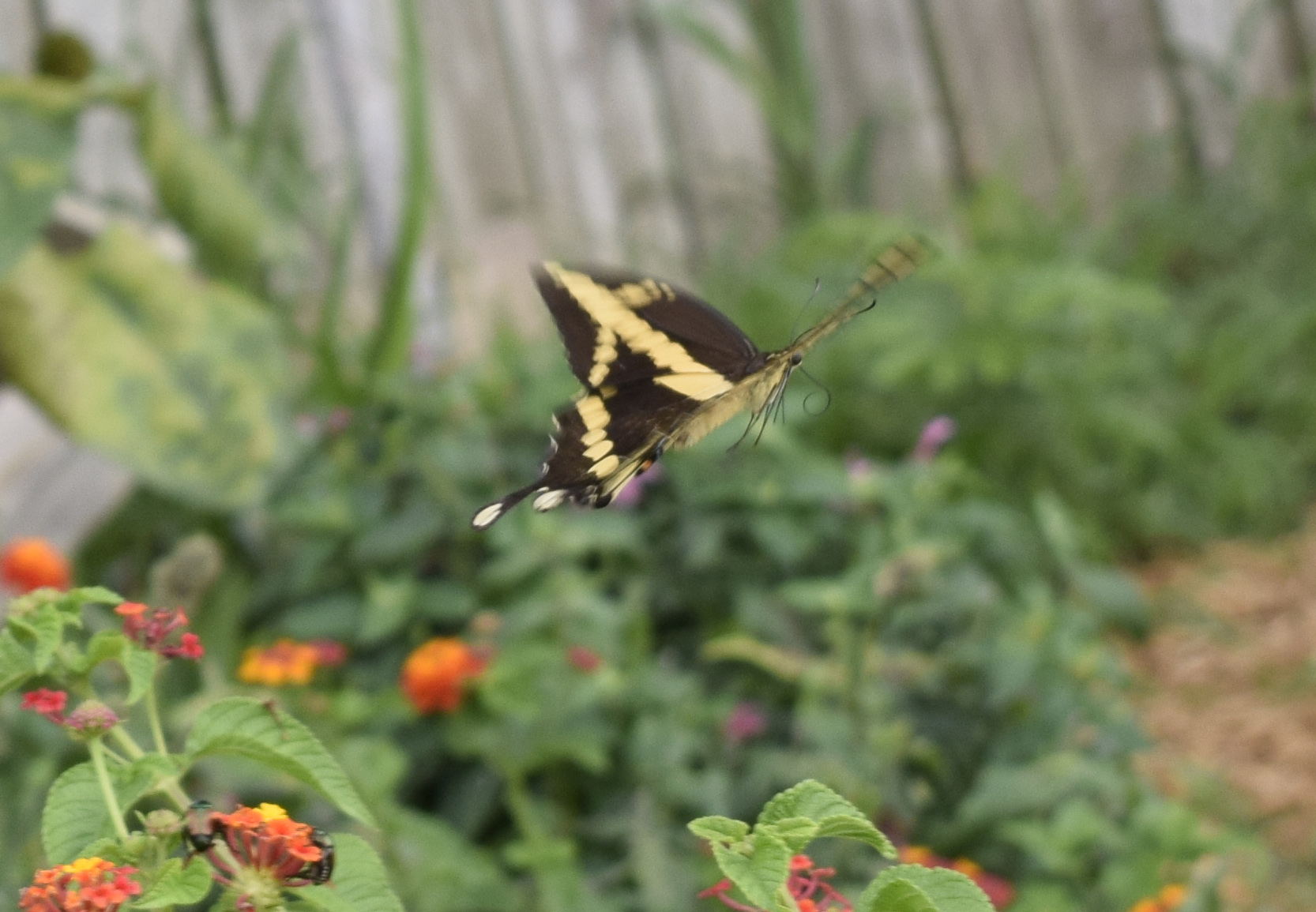 A Giant Swallowtail is captured by the camera in flight in the nectar garden.