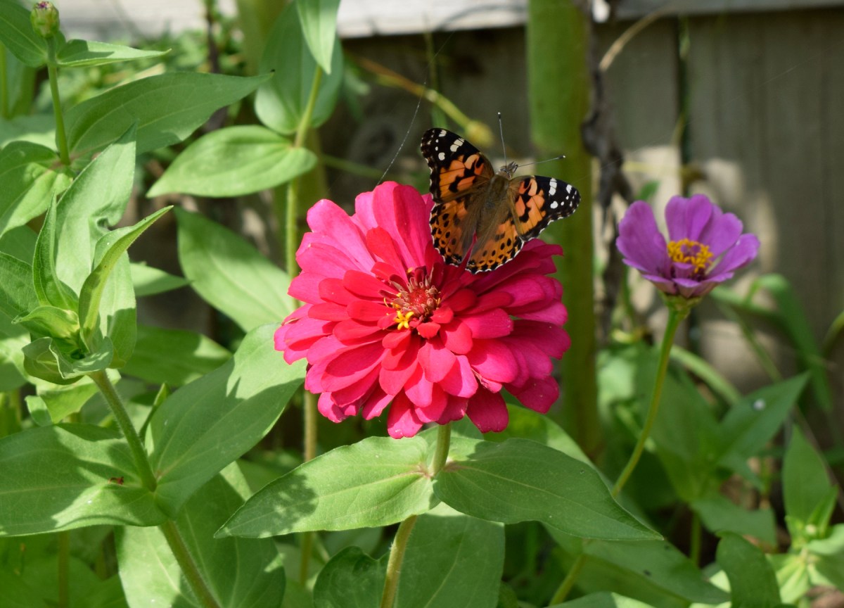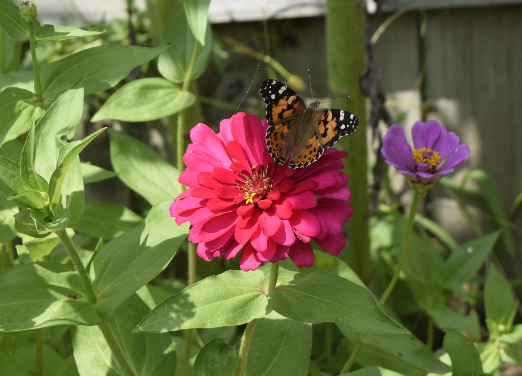 Zinnias are a favorite of the many Painted Lady butterflies that visit the garden in the summer months.