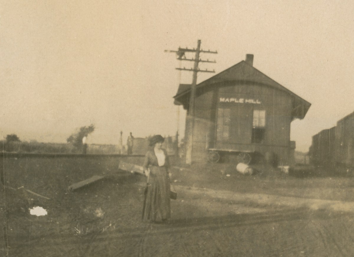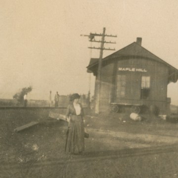 A passenger on the Rock Island railroad poses for a photo in front of the Maple Hill, Kansas depot, circa 1900.