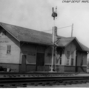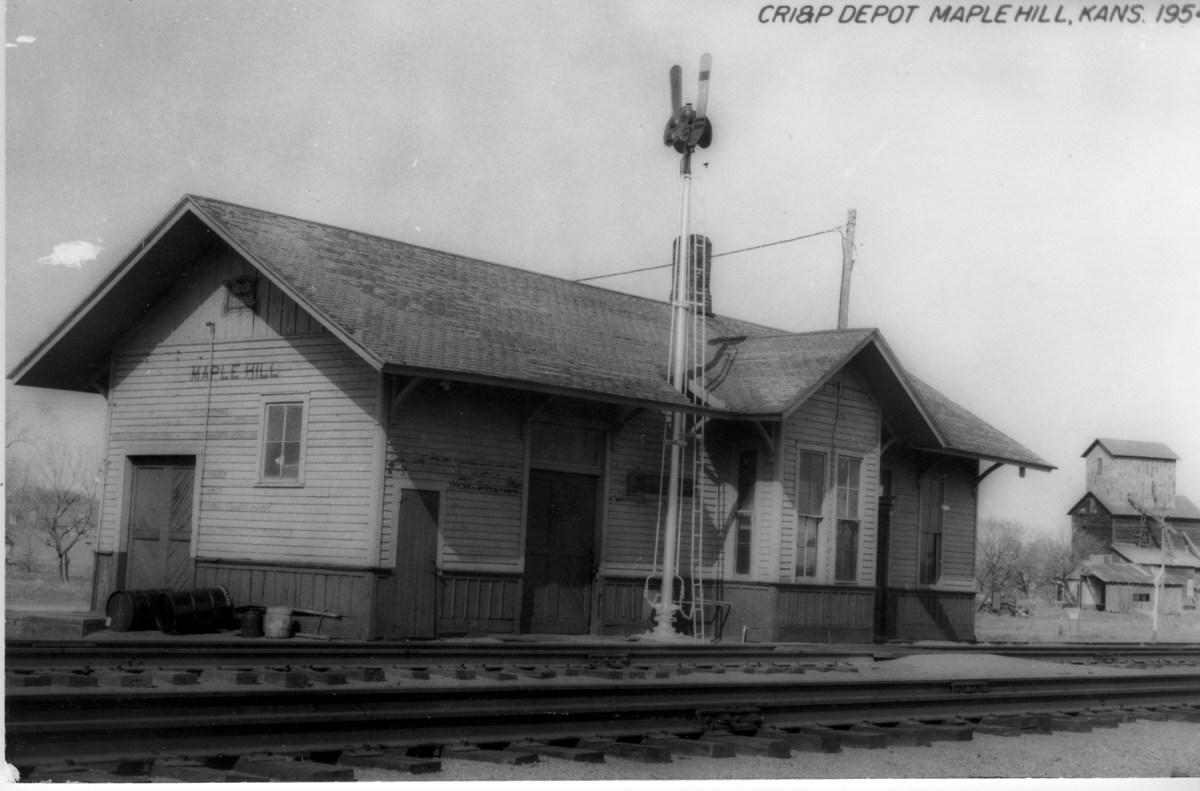 This real photo postcard view of the Rock Island depot at Maple Hill, Kansas is dated 1954. Notice the grain elevator in the background.