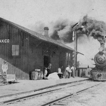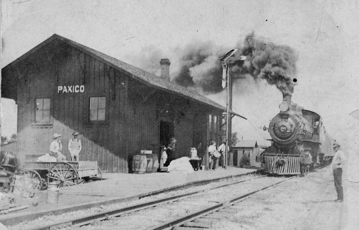 The Glotzbach brothers wait in their dray wagon as a steam engine arrives at the Paxico depot, circa 1910.