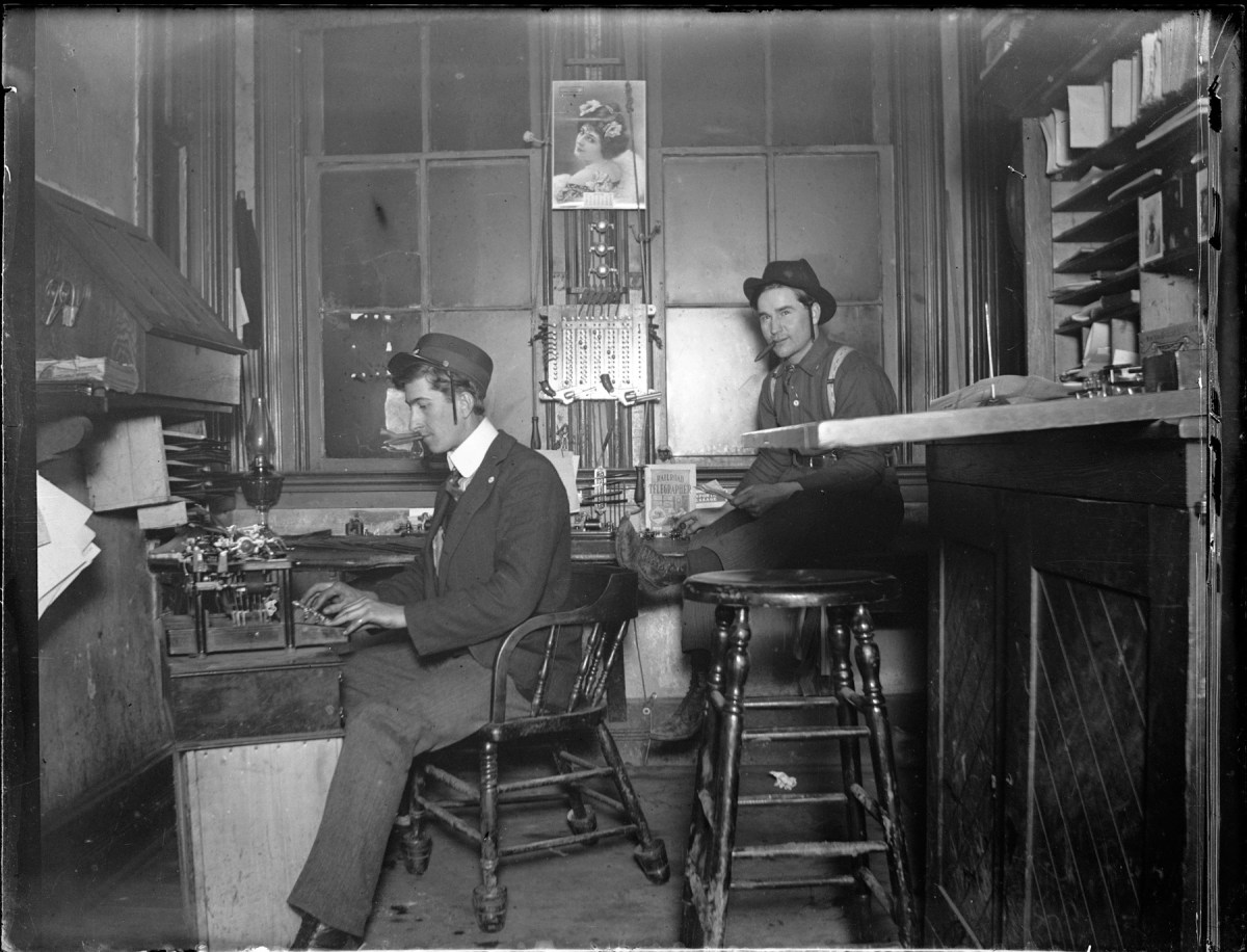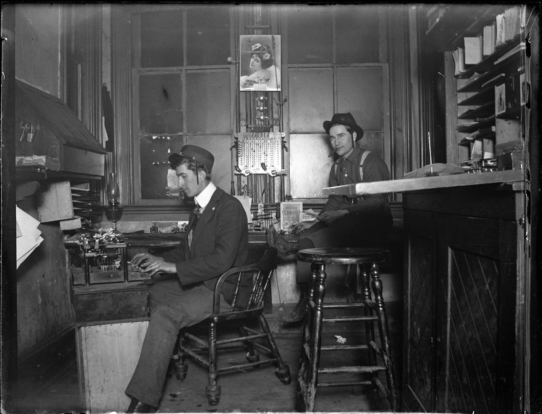 This interior photo of the telegraph office, located inside the Volland, Kansas depot, dates from about 1905.