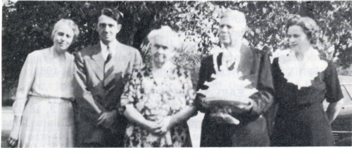 Members of the C. E. Carroll family, seen in this view which appeared in “New Branches from Old Trees”, included from left Marguerite Stuewe, Edwin Carroll, Myrtle Carroll, Carey Carroll and Lila Palmer.
