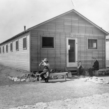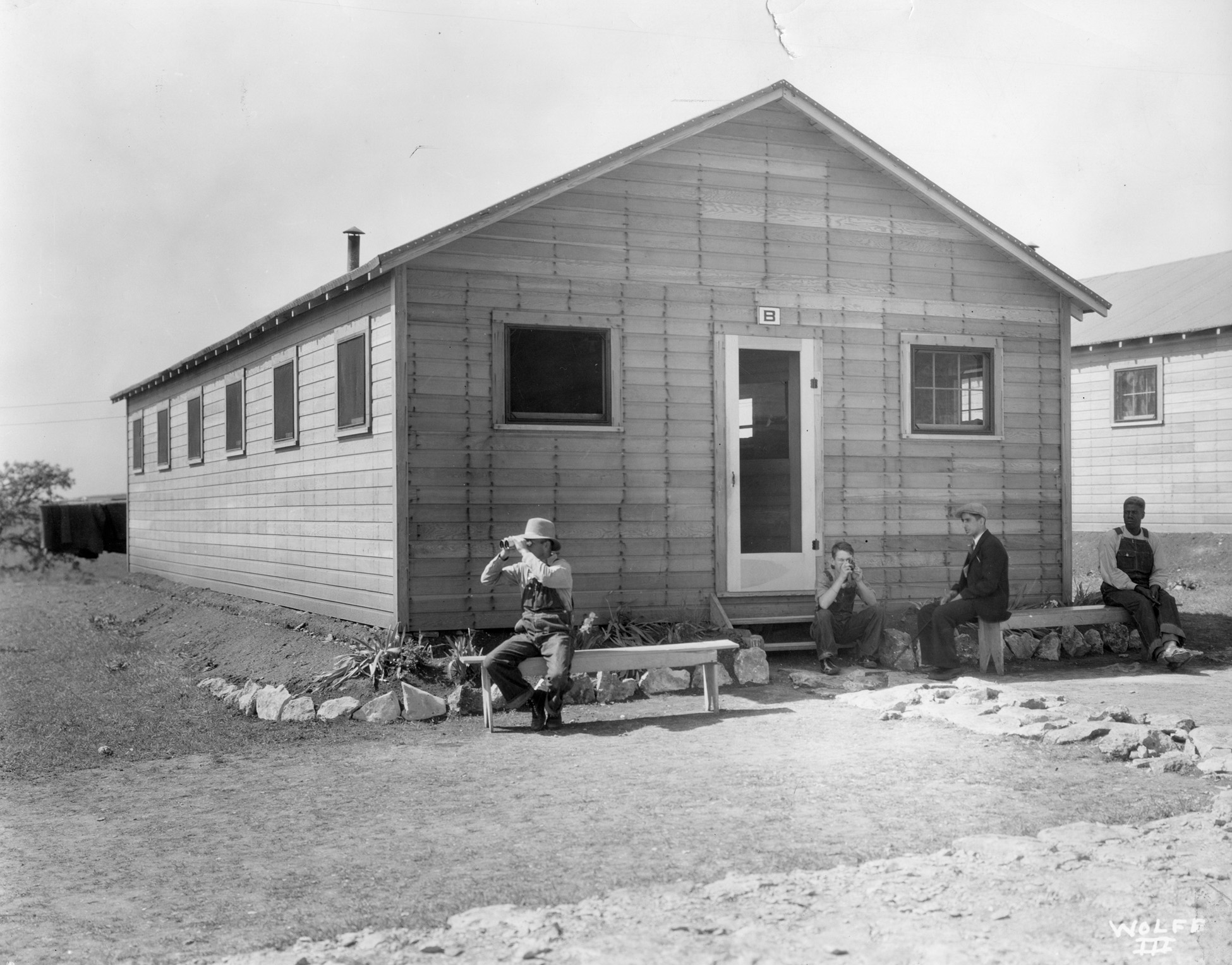 Workers at the KERC Transient Camp #5 relax in front of barracks No. 8 at the Lake Wabaunsee site in this Harold Wolfe view from 1934. Notice that the barracks buildings had yet to be painted.