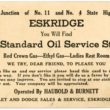 Haubold & Burnett constructed the Standard Oil Service Station located on the southeast corner of 2nd Avenue and Main Street in Eskridge in the mid-1920s.