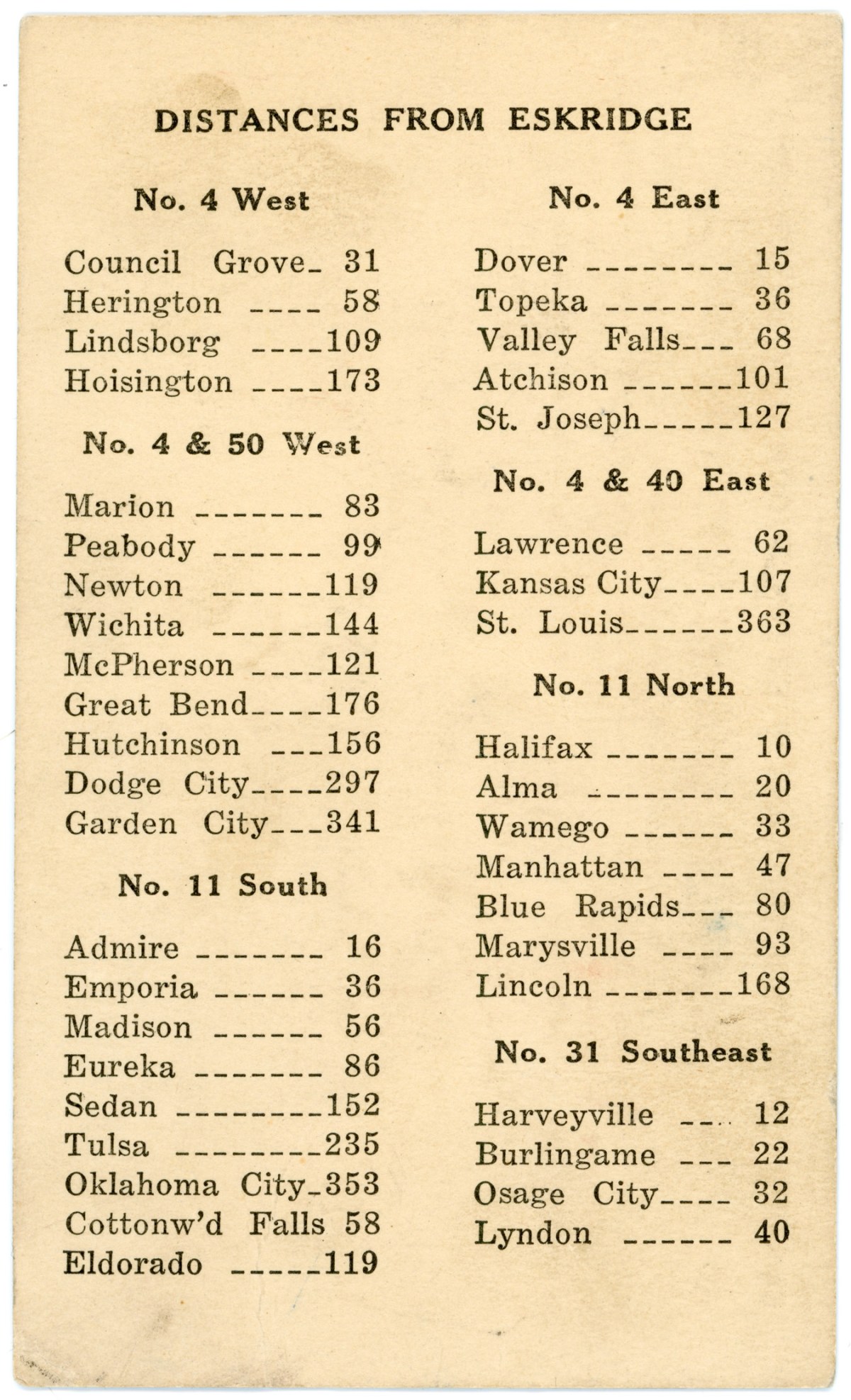 This handy advertising card for Haubold & Burnett’s Standard Oil Station in Eskridge showed distances to various cities in Kansas and neighboring states.