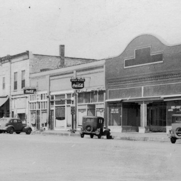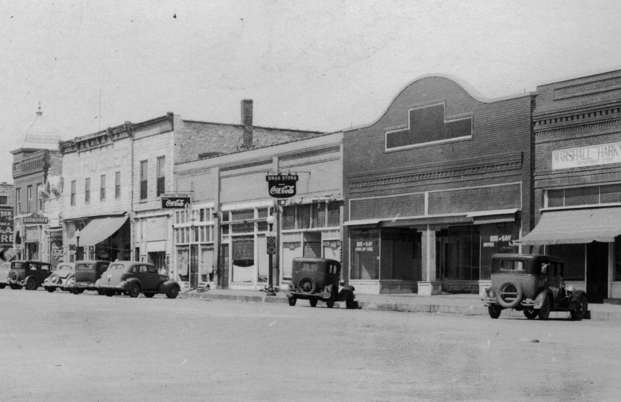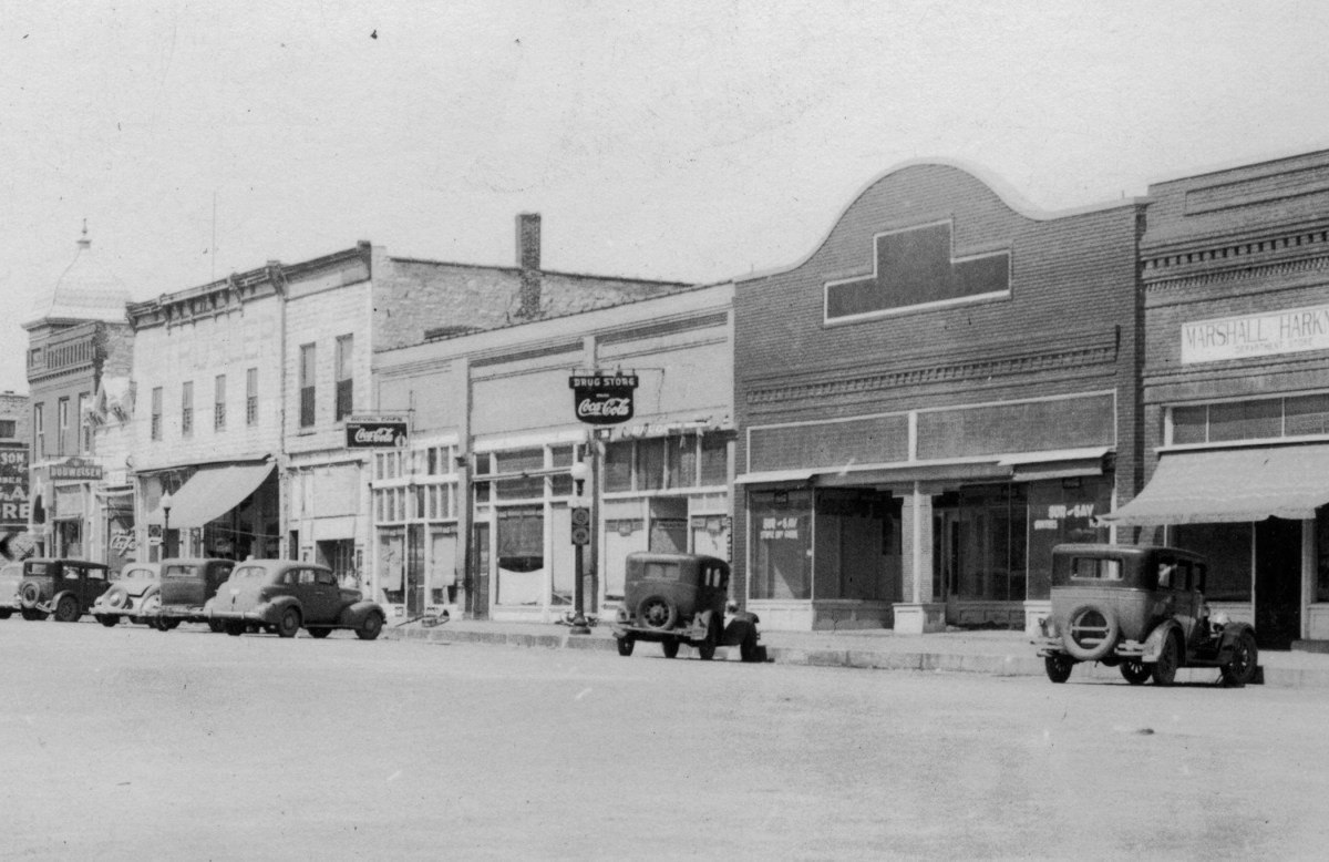 The Royal Cafe was located in the fifth storefront from the right in this 1930s view of the west side of the 100 block of South Main Street in Eskridge, Kansas.