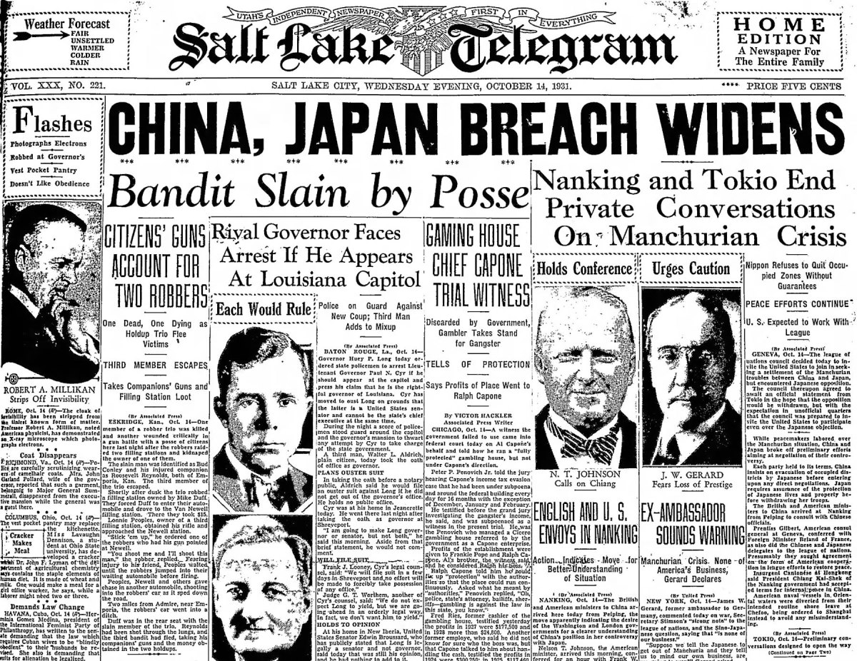 The robbery of two Eskridge, Kansas gas stations in 1931 and the ensuing pursuit of the robbers made the front page of the Salt Lake Telegram of October 14, 1931.