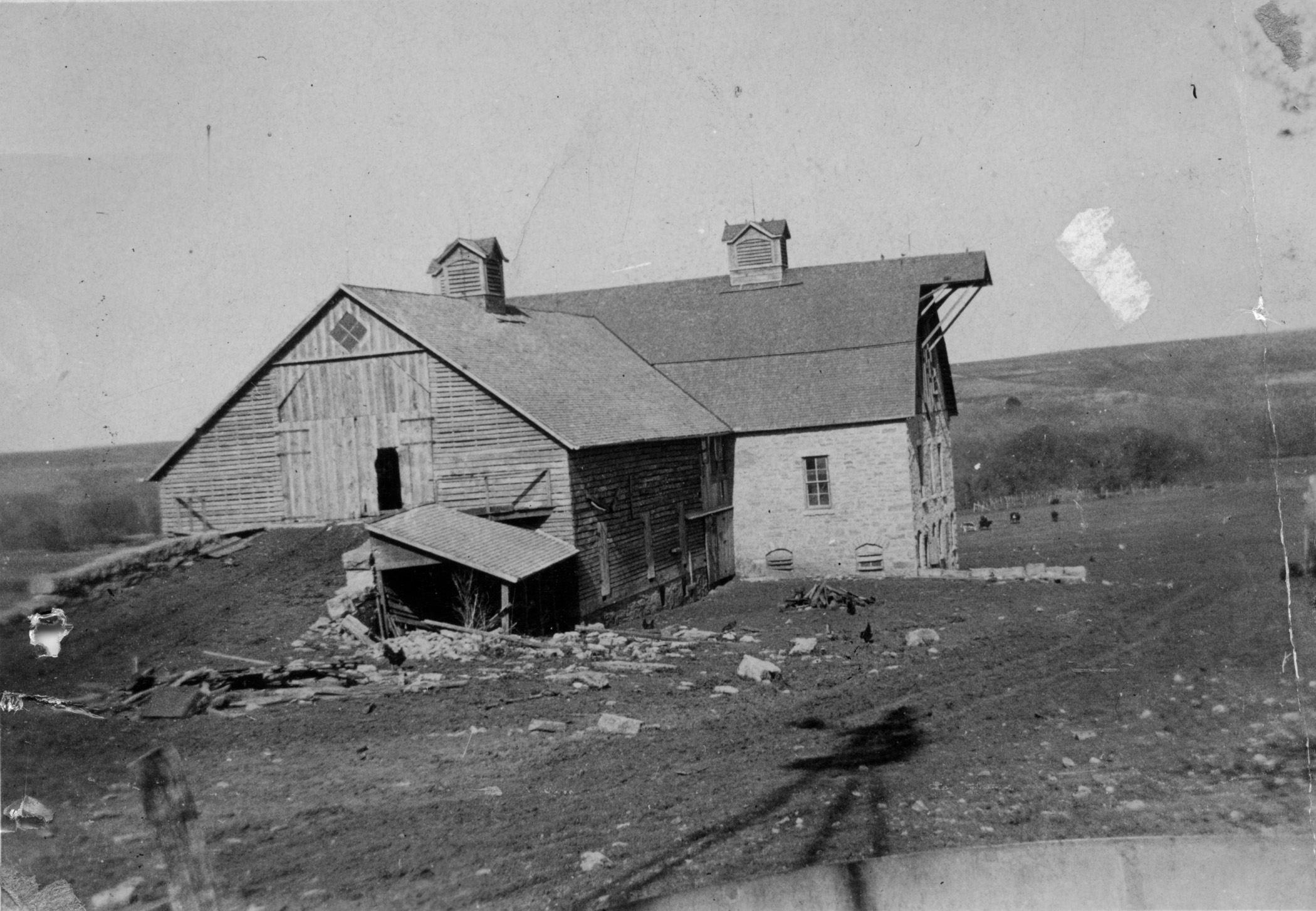 Notice in this 1921 view of the Schepp barn that there was an overhang for a hay carrier on the south roof peak.