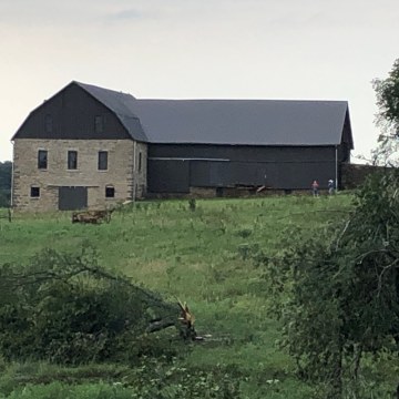 Damage from an August 15, 2019 tornado was limited to the north wall of the granary on the massive Schepp barn. (Image courtesy Abby Amick)